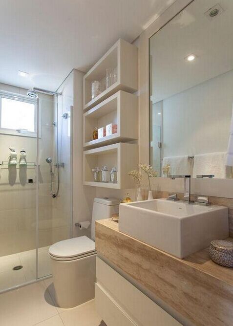 由于空间偏小,卫生间整体色简洁统一,再用一功能区域做效果和色彩点缀,简约中有态度,现代时尚感下不通俗有特点,内挖的收纳空间拉长了空间纵深。