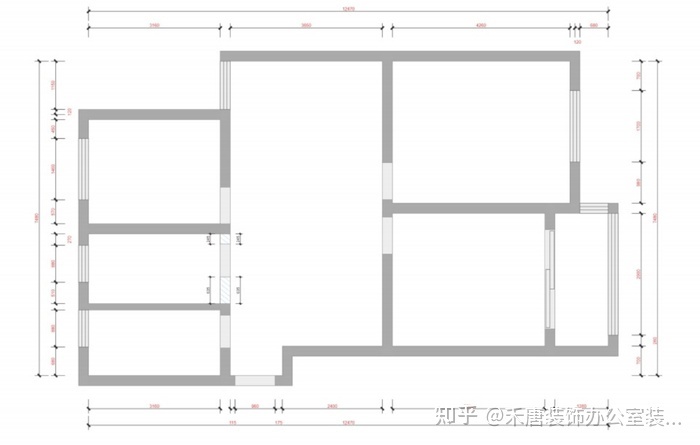 设计师量房之后,最先出的就是这张图纸,后期所有设计都以此图为基础,这包括:①房间的具体尺寸、墙体厚度、层高;②房间梁柱位置尺寸、门窗洞口的尺寸位置;③各项管井(上下水、煤气管道、空调暖管、进户电源)的位置、功能、尺寸等项目。