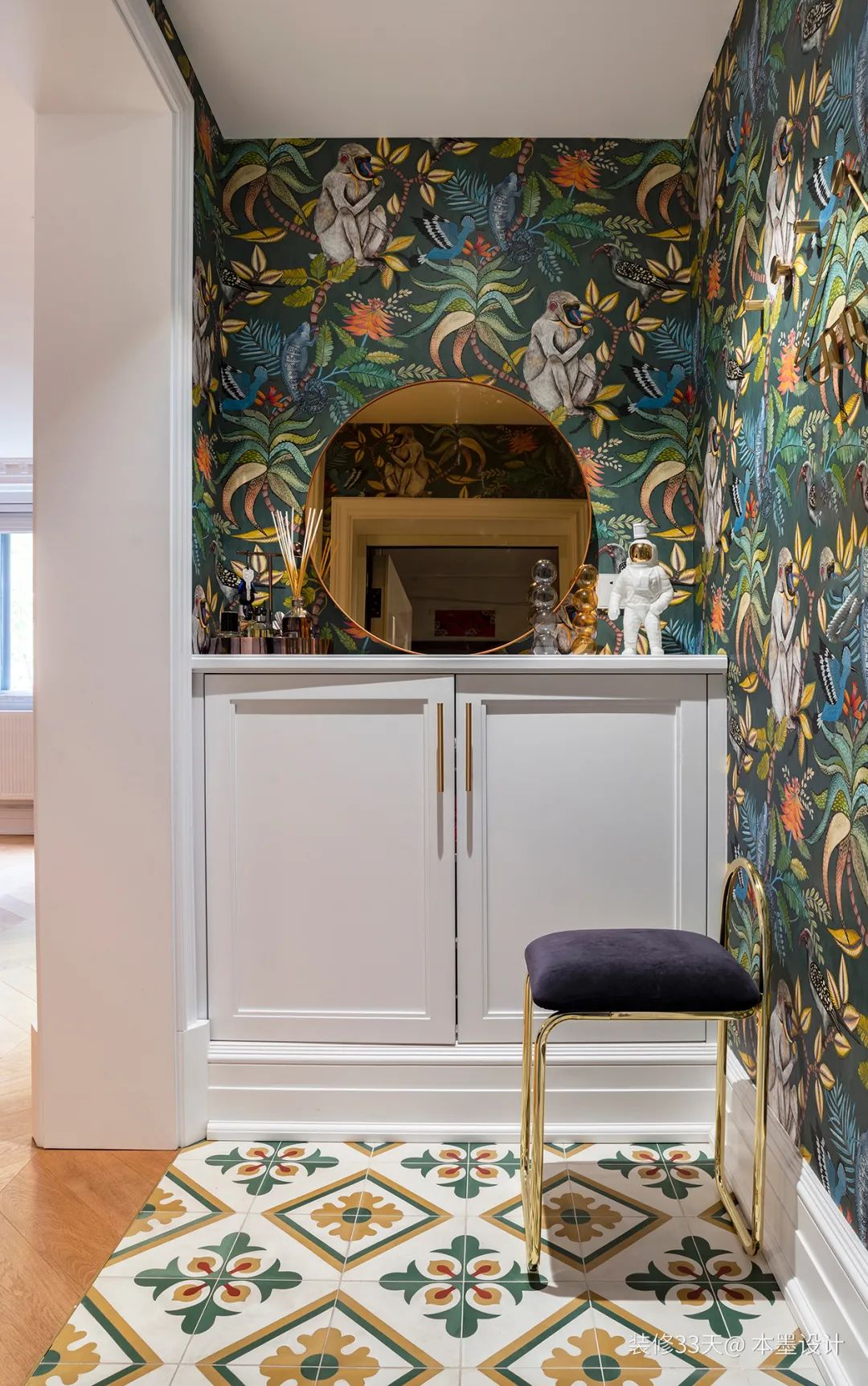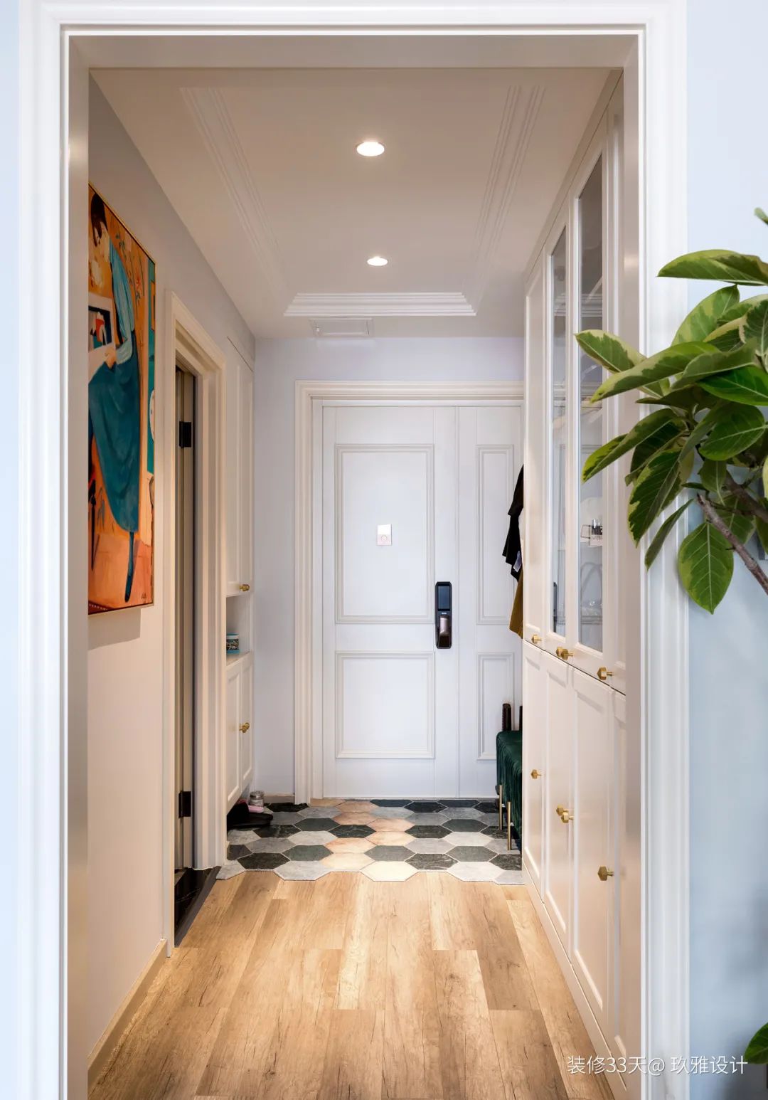 比如像上图这个案例这样,在入户门口的位置,买了一款六角砖图案的地毯,自己回家剪一剪,乍一看也像那么回事儿。而且地毯你还能想换就换,这个替代方案好像也没什么不好的。
