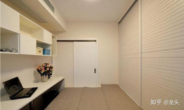 次卧是榻榻米房间,榻榻米房间也很满意,在次卧的一面墙上,也做了一个很大的衣柜,衣柜做到顶,很漂亮,还在另一面墙壁上做了书架和书桌,这样空间一点都不浪费。