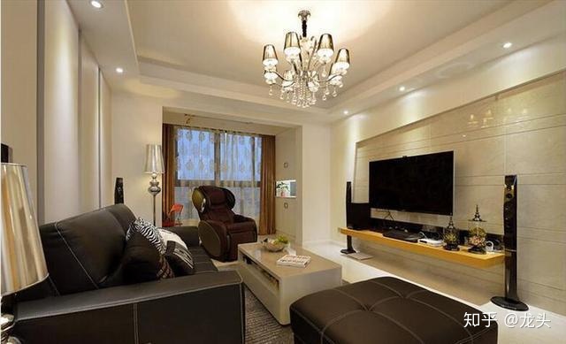 客厅面积比较大,还做了简单的吊顶,这设计我没的说,挺好的,立体感也挺不错的,吊顶线条明朗,沙发背景墙让人更温馨。黑色的真皮沙发和电视很协调。