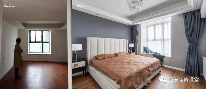 ▲撕掉卧室壁纸,更换更清爽的乳胶漆,拆除原有顶面线条以及石膏线,重新做宽边单眼皮以及窗帘盒,背景雾霾蓝突出,摆上家具窗帘进入即可