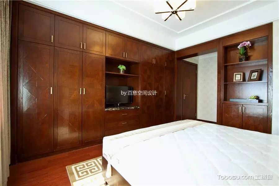 如果说非要找出主卧室另具有浓厚中式风格装修特点的元素,那便是眼前的整体家具了。定制的红褐色板式家具与墙壁完美贴合,古色古香,收纳容量也毫不含糊。好在入墙隔板上布置了三两绿植,中和了大片实木家具带来的端庄、沉重之感。